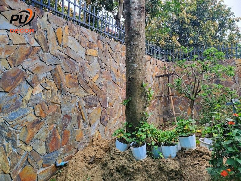 Khác với đá cắt quy cách, đá rối đa sắc mang đến cảm giác gần gũi thiên nhiên, rất phù hợp cho các hạng mục ốp tường ngoại thất, tường rào, tiểu cảnh sân vườn hoặc các mảng nhấn trang trí.