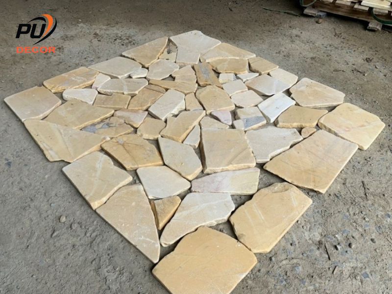 Tường nội thất: đá mỏng 15–20 mm, viên đá nhỏ–vừa để dễ ghép, tạo mảng nhấn tinh tế.