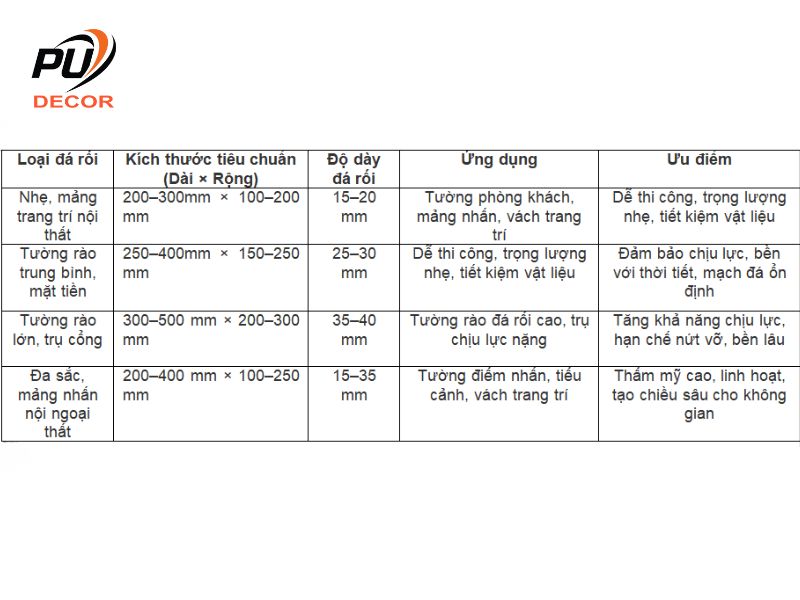 Để lựa chọn đúng kích thước đá rối và độ dày phù hợp với từng vị trí thi công, việc so sánh chi tiết các quy cách phổ biến trên thị trường sẽ giúp bạn dễ hình dung và đưa ra quyết định chính xác. Dưới đây là bảng tổng hợp thông số cơ bản và ứng dụng của từng loại