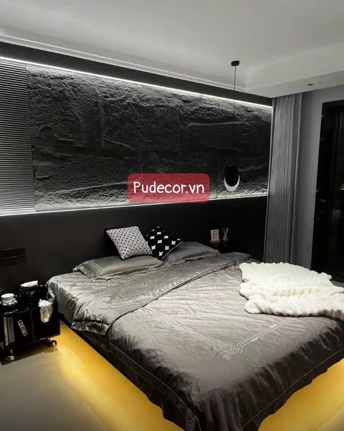 -Sử dụng tấm ốp tường PU giả đá với các màu sắc tối giúp tạo ra không gian phòng ngủ hiện đại và ấm áp.