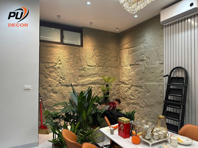 - Dễ tháo lắp, thay đổi concept: Khi cần làm mới không gian, PU giả đá có thể tháo gỡ hoặc thay thế từng mảng mà không ảnh hưởng toàn bộ bề mặt tường.
