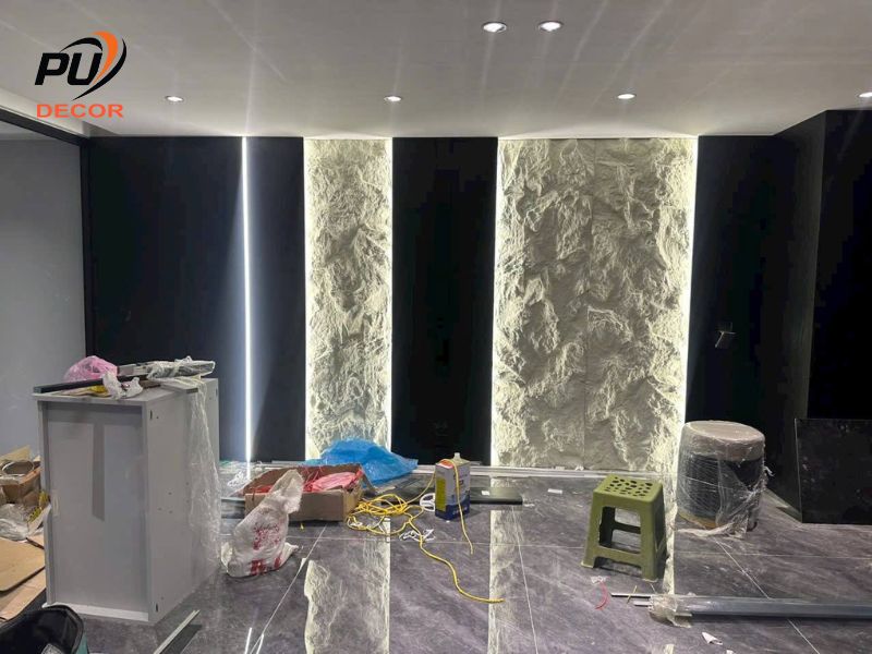 - Thi công nhanh, hạn chế đục phá: PU giả đá có thể dán trực tiếp lên tường phẳng bằng keo chuyên dụng, không cần xử lý nền phức tạp hay can thiệp sâu vào kết cấu.