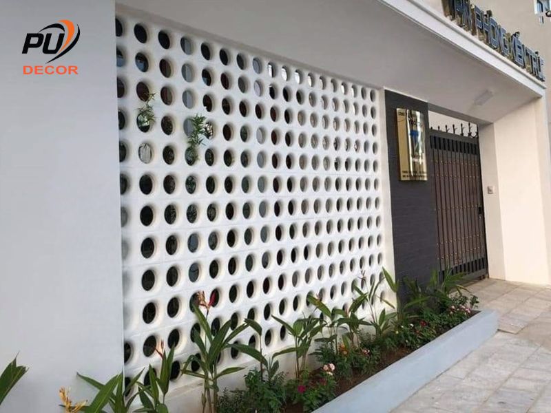 Tấm PU giả gạch bông gió thường được sử dụng cho mặt tiền, ban công, giếng trời hoặc khu vực cầu thang nhằm tạo độ thoáng, lấy sáng tự nhiên mà vẫn đảm bảo sự riêng tư. Trọng lượng nhẹ giúp vật liệu an toàn cho nhà cải tạo hoặc nhà xây trên nền móng cũ.