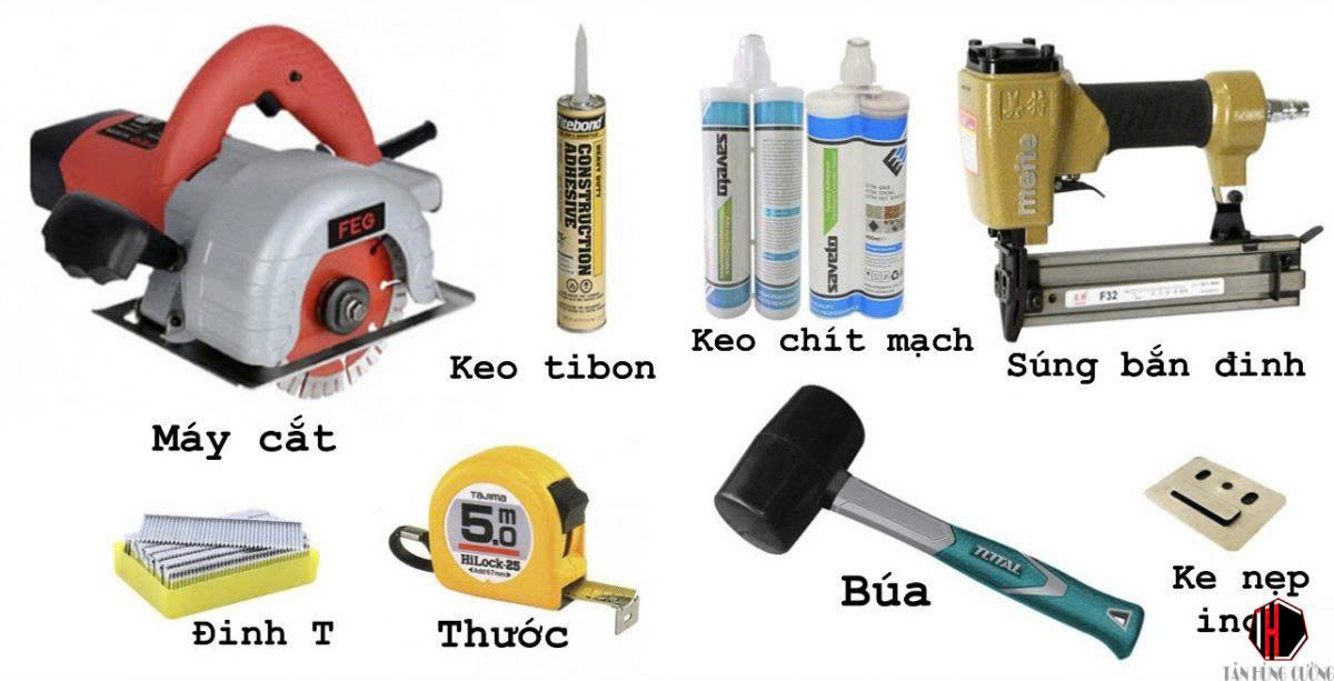 Thi công tấm ốp tường PU giả đá cần các loại dụng cụ như dao cắt,keo dán,thước đo,... trong đó quan trọng nhất là: